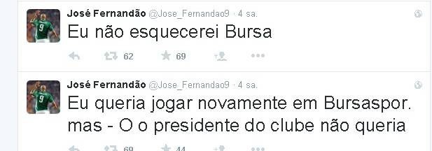 Bursaspor'da kiralık sözleşmesi sona eren Jose Fernandao, Twitter üzerinden yaptığı paylaşımda, yeşil-beyazlı kulüpte kalmak istediğini ancak başkan Bölükbaşı'nın bu isteğe karşı olduğunu ifade etti. 22 golle bu sezon gol kralı olan Fernandao, Bursaspor'u asla unutmayacağını da vurguladı.