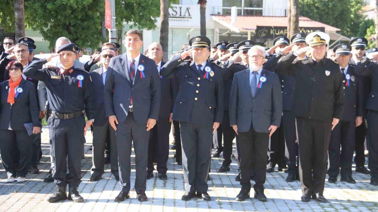 Tören, Fethiye Kaymakamlık Binası Atatürk Anıtı önünde gerçekleştirildi. Emniyet Müdürü Salih Murat Kara, burada öncelikle Atatürk Anıtı’na çelenk sundu. Ardından, Cumhuriyetimizin kurucusu Gazi Mustafa Kemal Atatürk ve tüm şehitlerimiz için bir dakikalık saygı duruşunda bulunuldu. Saygı duruşunun ardından İstiklal Marşı okundu.