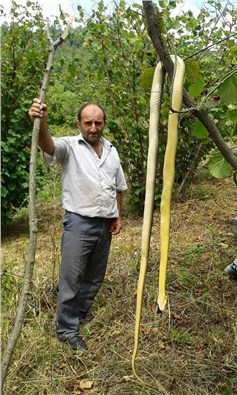TOKAT - Tokat’ın Erbaa ilçesine bağlı Gökal kasabasında öldürülen yılan pitonları aratmadı. Sabah fındık toplamak için tarlasına giden Ali Osman Göksu tarlasında dev yılanla karşılaştı. Ne yapacağını bilemeyen tarla sahibi, eline geçen bir dal parçasıyla o an yılana vurmaya başladı ve yılanı güçlükle öldürdü. Ali Osman Göksü, “Yılanı ilk gördüğüm de korktum heyecanlandım. İnsanlar ve çevrenin zara görmemesi için yılanı öldürmek zorunda kaldım." dedi.