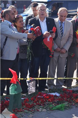 Öte yandan bombalı saldırının gerçekleştirildiği Ankara Tren Garı önüne vatandaşların ziyaretleri de devam ediyor. Kimi vatandaşlar üzgün bakışlarla olay yerinde duran ayakkabıya ve fotoğraflara bakarken; kimi vatandaşlar ise cep telefonlarıyla fotoğraf çekiyor. Olay yerindeki trafik akışı normal seyrederken; araçlarda bulunan vatandaşlar da camlardan olay yerine bırakılan karanfillere bakıyor. CİHAN