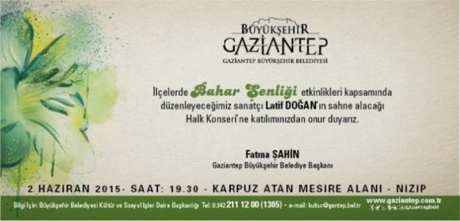 Gaziantep Büyükşehir Belediyesi, ilçelerde “Bahar Şenliği” etkinliği düzenliyor. Nizip ilçesinde gerçekleştirilecek olan bu etkinlik, sanatçı Latif Doğan’ın konseriyle başlayacak. Ayrıca, Karpuzatan Mesire Alanı'nın da açılışı yapılacak. Gaziantep Büyükşehir Belediye Başkanı Fatma Şahin’in katılımıyla gerçekleşecek olan etkinlik, 2 Haziran tarihinde saat 19.30'da Nizip Karpuzatan Mesire Alanı’nda gerçekleştirilecek.