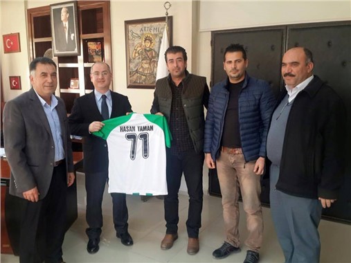 Bu arada Erzin Kaymakamı Hasan Yamanı ziyaret eden kulüp yönetimi, kendisine üzerinde ismi yazılı takımın formasını hediye etti.