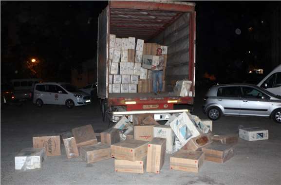 Bir ihbarı değerlendiren Kahramanmaraş Emniyet Müdürlüğü Kaçakçılık ve Organize Suçlarla Mücadele Şube Müdürlüğü (KOM) ekipleri, Van'dan yol çıktığı belirlenen 33 DJK 46 plakalı TIR'ı Kahramanmaraş- Adana karayolunda durdurarak aradı. Yapılan aramada TIR'ın dorsesinde gümrük kaçağı 500 bin paket çeşitli markalarda sigara ele geçiren ekipler, sürücü M. K.'yı (35) gözaltına aldı.