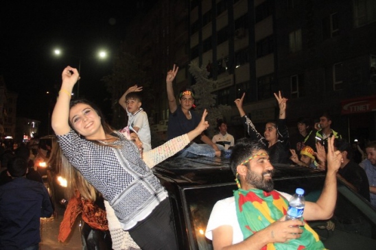 Hakkari'de, resmi olmayan seçim sonuçlarının açıklanmasının ardından, Bulvar Caddesi'nde bulunan belediye binası önünde yüzlerce kişi toplandı. Kutlamalara katılanlar, 7'den 70'e geniş bir kitle oluşturdu ve yaya ile araçlarla şehir turu attı.