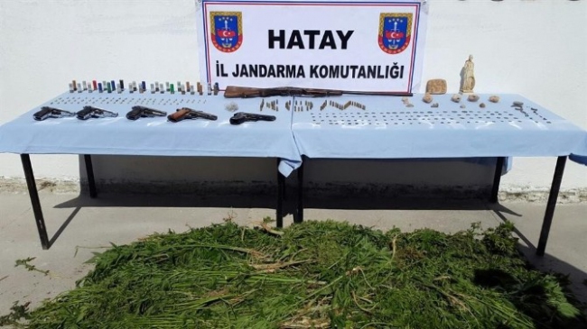 Hatay ilinde jandarma ekipleri, kaçakçılık ve organize suçlarla mücadele kapsamında bir eve baskın düzenledi. Bu operasyonda, 1.412 kök Hint keneviri, 8 gram kubar esrar, bir av tüfeği, 31 adet av tüfeği fişeği, 5 tabanca ve bu tabancalara ait 4 şarjör ile 125 tabanca mermisi ele geçirildi. Ayrıca, 106 sikke, bir kadın heykeli ve bir erkek başı figürü bulunan dikdörtgen obje de bulundu. Olayla ilgili olarak bir kişi gözaltına alındı ve soruşturmanın devam ettiği bildirildi.