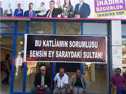 KESK, DİSK, TMMOB ve TTB’nin de aralarında bulunduğu, çok sayıda siyasi parti ve derneğin destek verdiği Ankara'daki ‘Emek, Barış ve Demokrasi Mitingi’ne yönelik bombalı saldırı ile ilgili tepkiler devam ediyor. HDP Suruç İlçe Teşkilatı da olayla ilgili tepkisini dile getirmek amacıyla ilçe seçim bürosuna, 'Bu katliamın sorumlusu sensin ey saraydaki sultan!' şeklinde pankart astı. CİHAN