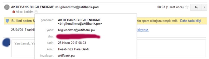 Bilişim ve Yazılım Uzmanları, "son günlerde artan bahse konu sahte mail "aktifbank.pw" alan adı üzerinden gönderildiği bildirilirken, gelen mail de "25/04/2017 tarihli adınıza Gelen 2649 TL'lik EFT transferi işleminizin dekontunu görmek için tıklayınız." şeklinde üzerine tıklanılabilir link içeren yazı bulunuyor. Mailin içinde yer alan linke kesinlikle tıklanmaması gerekiyor. Sahte maillerin hedefi şirketlere ait kurumsal mail hesapları olduğu gibi, normal kullanıcı mail adreslerine de kimlik avı amacıyla mailler gönderiliyor. Hergeçen gün yeni yöntemlerle internet ortamında bilgi hırsızlığı devam ediyor." dediler.