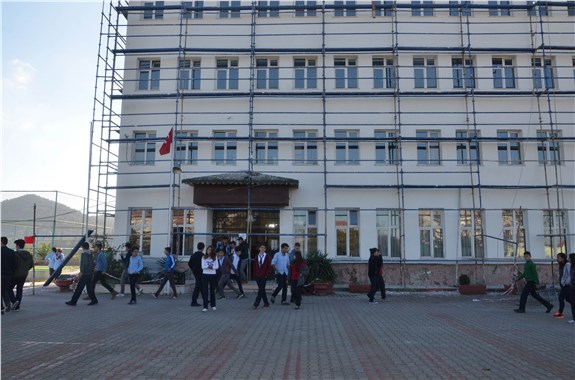 ZONGULDAK - Zonguldak'ın Kozlu ilçesinde, 750 öğrencinin eğitim gördüğü lise binasının dış kaplama, çatı onarımı ve inşaat çalışmaları devam ediyor. İnşaat iskelelerinin altından okula giriş çıkış yapan öğrenciler; 'inşaat sahasında dikkatli olunuz', 'şantiye sahası girilmez' ve 'inşaata girmek tehlikeli ve yasaktır' yazılı uyarı levhaları eşliğinde eğitim görüyor.