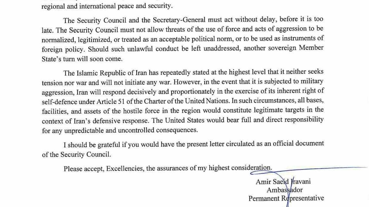 İran’ın gerilim ya da savaş arayışında olmadığını, ancak kendisini savunmaya kararlı olduğunu yineleyen Iravani, "Ülkemiz, askerî saldırıya maruz kalması halinde, BM Şartı’nın 51. maddesi kapsamında sahip olduğu meşru müdafaa hakkını kullanarak kararlı ve orantılı biçimde karşılık verecektir. Böyle bir durumda, düşman kuvvetlere ait bölgedeki tüm üsler, tesisler ve varlıklar İran’ın savunma kapsamındaki meşru hedefleri olacaktır. Doğabilecek öngörülemeyen ve kontrol edilemez sonuçların tüm sorumluluğu doğrudan ABD’ye aittir" ifadelerini kullandı. Irevani, gönderdiği mektubun resmi bir belge olarak BM üyesi devletlere iletilmesi talebinde bulundu.