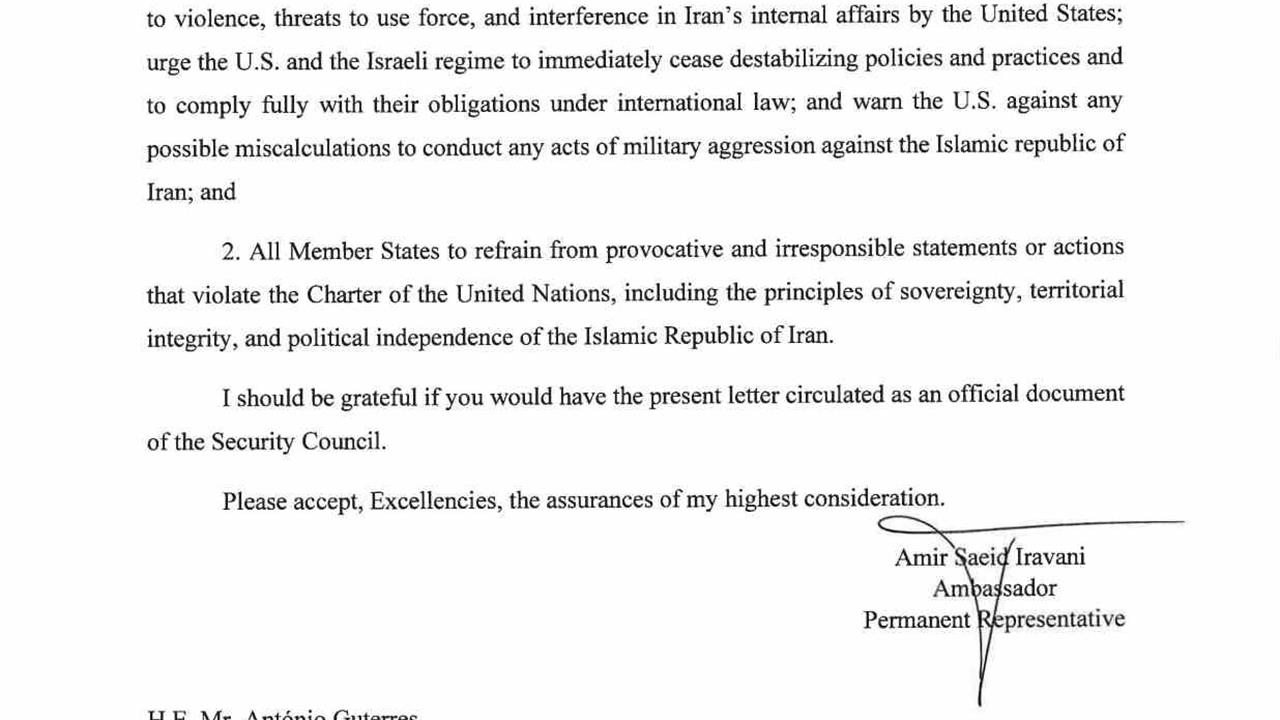 BM Genel Sekreteri Antonio Guterres'e hitap eden İravani, BM Güvenlik Konseyi ve üye ülkelerden ABD’nin İran'ın iç işlerine müdahalesine karşı çıkmasını istedi. İravani, tüm üye devletlerin, İran İslam Cumhuriyeti’nin egemenliğine ve siyasi bağımsızlığına saygı göstermeleri gerektiğini belirtti. Mektubunun resmi belge olarak BM Güvenlik Konseyi üyesi ülkelere dağıtılmasını talep eden İravani, bu konunun ciddiyetine dikkat çekti.