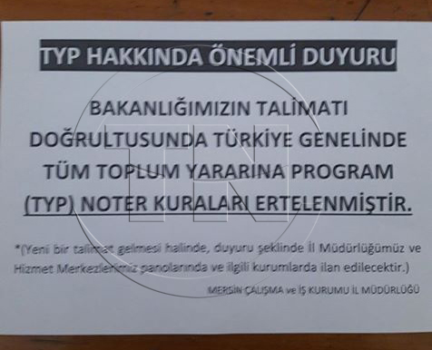 Bugün büyük bir umutla İŞKUR Mersin Şubesine kura çekimi için giden vatandaşlar kurumun giriş kapsında, “Bakanlığımızın talimatı doğrultusunda TYP Kuralları ertelenmiştir” yazılı duyuru notuyla karışılarak hayal kırıklığı yaşadılar. (Haber:TarsusNews.com)