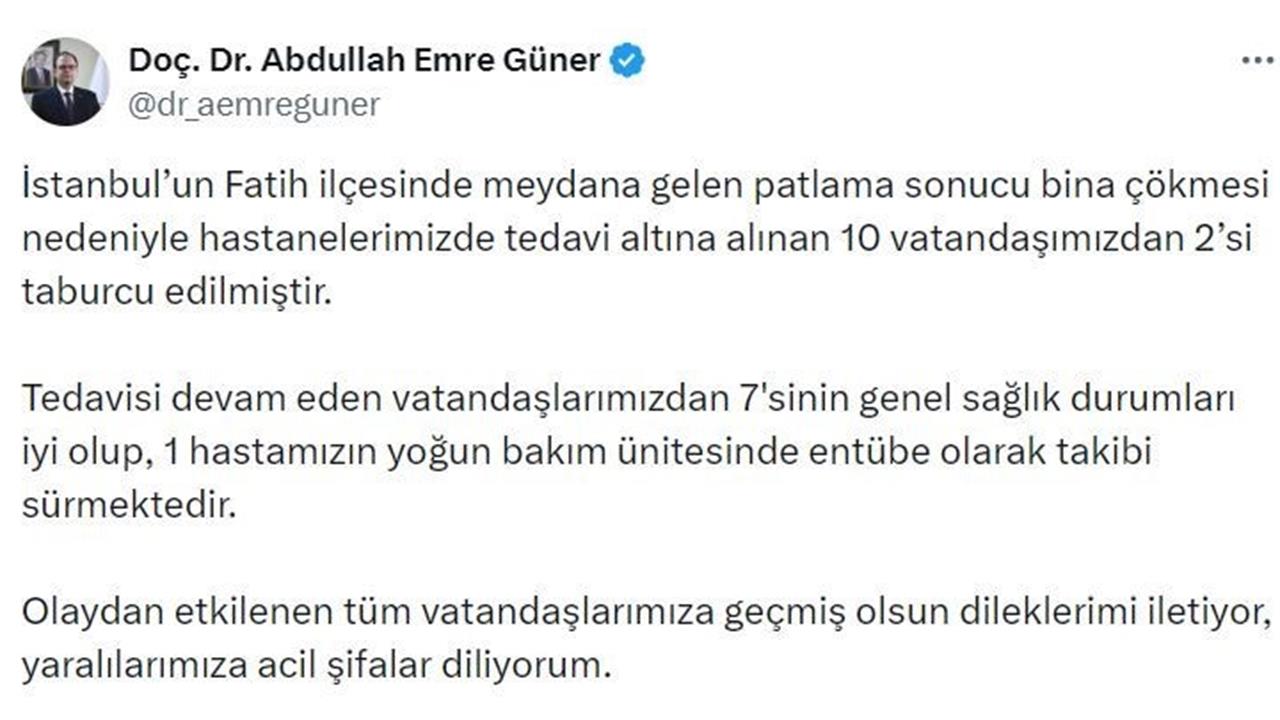 İstanbul İl Sağlık Müdürü Doç. Dr. Abdullah Emre Güner, Fatih ilçesinde meydana gelen bina çökmesi ile ilgili olarak yaralananların sağlık durumunu değerlendirdi. Güner, "İstanbul’un Fatih ilçesinde meydana gelen patlama sonucu bina çökmesi sebebiyle hastanelerimizde tedavi altına alınan 10 vatandaşımızdan 2’si taburcu edilmiştir. Tedavisi devam eden vatandaşlarımızdan 7’sinin genel sağlık durumları iyi olup, 1 hastamızın yoğun bakım ünitesinde entübe olarak takibi sürmektedir" şeklinde konuştu. Olayın ardından, etkilenen tüm vatandaşlara geçmiş olsun dileklerini ileten Güner, yaralılara acil şifalar diledi.