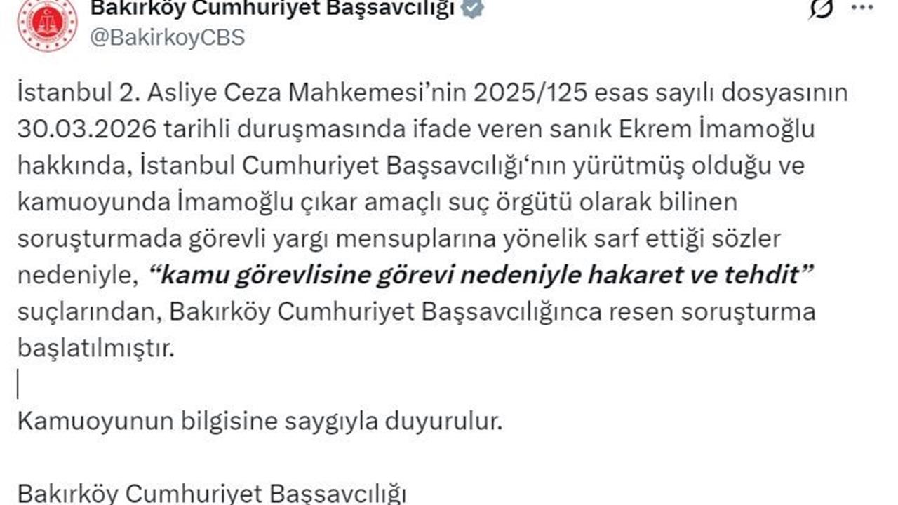 İstanbul Büyükşehir Belediye Başkanlığı görevinden uzaklaştırılarak tutuklanan Ekrem İmamoğlu, yürütülen davada bazı bilirkişileri hedef göstererek yargı görevini etkilemeye çalıştığı iddiasıyla yargılanıyor. Duruşma sürecinde İmamoğlu, "kamu görevlisine görevi nedeniyle hakaret ve tehdit" suçlamasıyla tekrar gündeme geldi. Bakırköy Cumhuriyet Başsavcılığı'nın açıklamasında, "İstanbul 2. Asliye Ceza Mahkemesi’nin 2025/125 esas sayılı dosyasının 30.03.2026 tarihli duruşmasında sanık Ekrem İmamoğlu'nun, kamuoyunda İmamoğlu çıkar amaçlı suç örgütü olarak bilinen soruşturmada görevli yargı mensuplarına yönelik sarf ettiği sözler nedeniyle bu soruşturmanın başlatıldığı" ifadesine yer verildi.