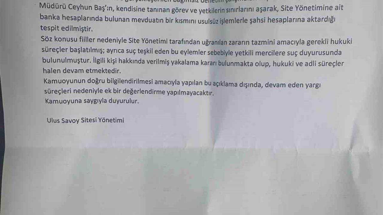 Söz konusu vurgunla ilgili olarak, yetkililer hukuki süreçlerin başlatıldığını ifade etti. Yakalama kararı çıkarılan Ceyhun Baş hakkında, site yönetimi tarafından suç duyurusunda bulunulduğu kaydedildi. Ayrıca, site yönetimi uğradıkları zararın tazmini için gerekli hukuki yolları da takip etmektedir.