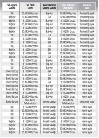 Sigortalılık statüsü farklı ve eş ve anne-babanın ikisi de 1 Ekim 2008 tarihinden önce ölmüşse iki maaş bağlanıyor. Eş ve anne-babadan biri 1 Ekim 2008'den önce diğeri 1 Ekim 2008'den sonra ölmüşse yine iki maaş var. Eğer, iki ölüm de 1 Ekim 2008'den sonra ise sadece bir maaş ödenir.