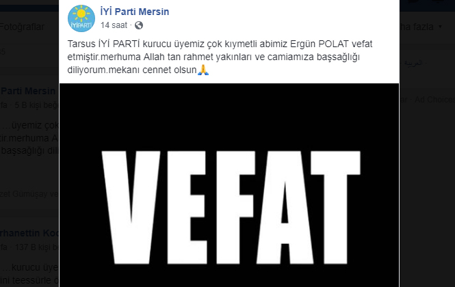 İyi Parti Tarsus ilçe kurucu yönetim kurulu üyesi olarak siyaset ile de uğraşan Polat’ın vefat haberini alan sevenleri büyük üzüntü yaşadı.