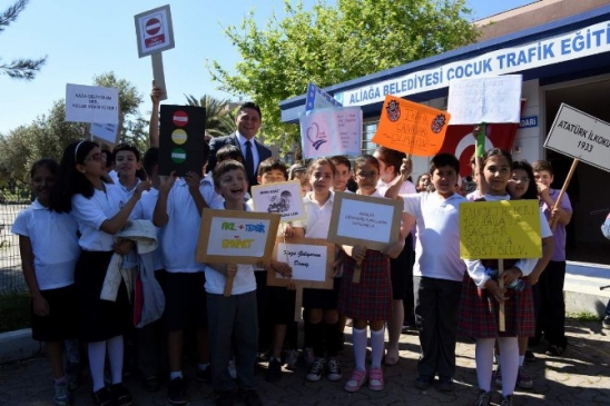 Aliağa İlçe Emniyet Müdürlüğü ve Aliağa Belediyesi iş birliğiyle yürütülen ‘Trafik Hayattır’ projesi kapsamında, ilköğretim çağındaki çocuklara temel trafik eğitimi verildiği belirtildi. Eğitimler, Trafik Eğitim Parkı’nda teorik ve uygulamalı olarak gerçekleştiriliyor. Çocukların öğrendiklerini akülü arabalarla uygulayarak pekiştirmeleri sağlanıyor. Ayrıca, 2014-2015 yıllarında ‘Trafik Dedektifleri’ isimli projeyle 4 bin 200 öğrenciye eğitim verilmiş ve katılan öğrencilere kartlar verilmiştir.