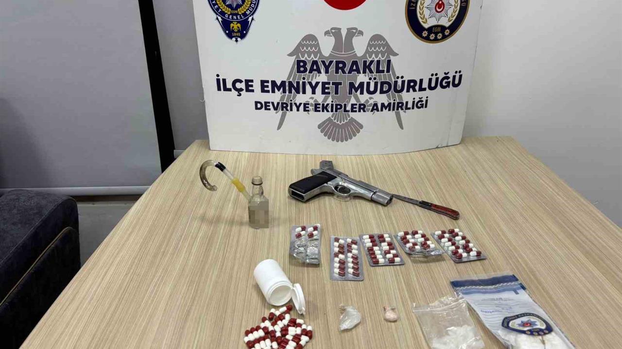 Bayraklı İlçe Emniyet Müdürlüğü Devriye Ekipler Amirliği, 2118 Sokak'ta park halindeki bir Tofaş aracının etrafında şüpheli davranışlar sergileyen 3 kişiyi fark etti. Ekipler, durumu araştırmak üzere yaklaşınca, motosikletli bir kişi hızla olay yerinden uzaklaştı. Yapılan incelemeler neticesinde, kaçan motosiklet sürücüsünün O.D. olduğu belirlendi ve uyuşturucu suçlarından sabıkalı olduğu tespit edildi. Araçtaki şahıslara yönelik yapılan aramada 45,1 gram metamfetamin ele geçirildi. Bu maddenin O.D.’den alındığı anlaşıldı. Ardından, O.D.’nin evine savcılıktan alınan talimatla baskın düzenlendi. Evde yapılan aramalarda, 1 ruhsatsız tabanca, 93 adet uyuşturucu hap, 14,4 gram metamfetamin, 1 adet bong düzeneği, 7 bin 835 TL nakit para ve bir bıçak bulundu. Aynı zamanda, evde firari olarak aranan D.U. da yakalandı. D.U.’nun 2 yıl 1 ay hapis cezası bulunduğu öğrenildi. Olayla bağlantılı Y.S.S. ve A.K. isimli şahıslar da suç unsurlarıyla birlikte gözaltına alındı. O.D. ve İ.U. ise işlemlerinin ardından tutuklandı.
