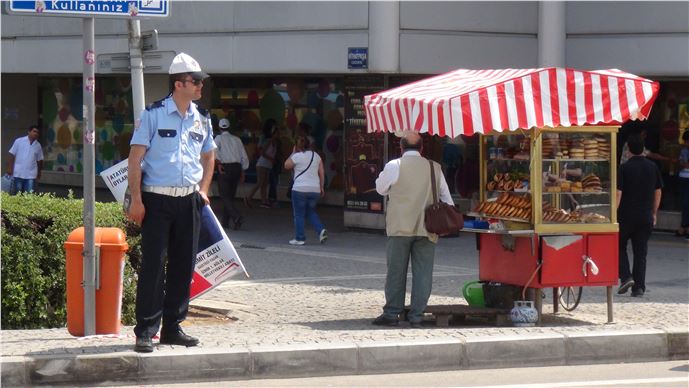 İzmir Konak Tüneli'nde yaya geçidi eksikliği nedeniyle trafik polisleri nöbet tutarak yayalara metro alt geçidini kullanmaları için anons yapıyor.