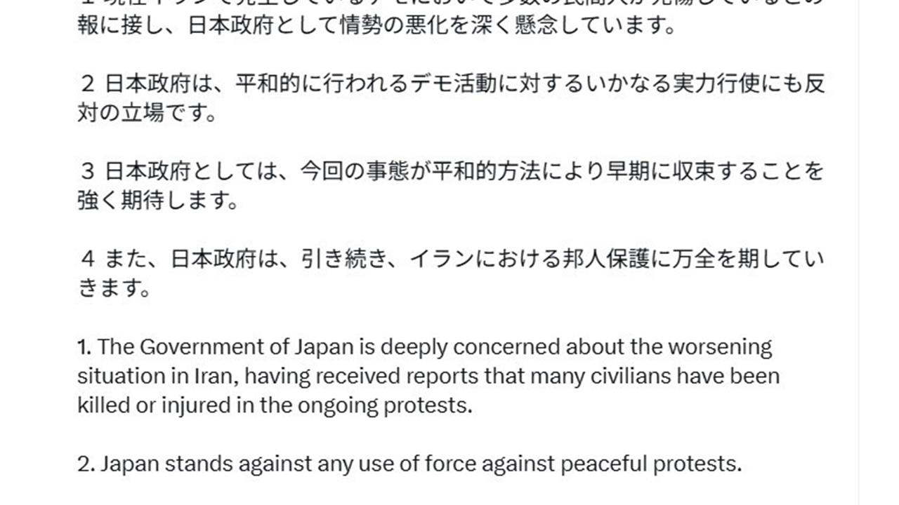 Japonya Başbakanı Sanae Takaichi, İran'da 28 Aralık'tan bu yana devam eden protestolarla ilgili olarak, sosyal medya üzerinden açıklamalarda bulundu. Takaichi, bu süreçte çok sayıda sivilin hayatını kaybettiği veya yaralandığına dair haberlerin kendilerini derinden endişelendirdiğini ifade etti. "Japonya hükümeti, İran'daki kötüleşen durumdan derin endişe duymaktadır" dedi. Ayrıca, Japonya'nın barışçıl protestolara yönelik her türlü güç kullanımına karşı olduğunu belirterek, bu durumun derhal barışçıl yollarla çözüme kavuşturulmasını temenni ettiklerini vurguladı.