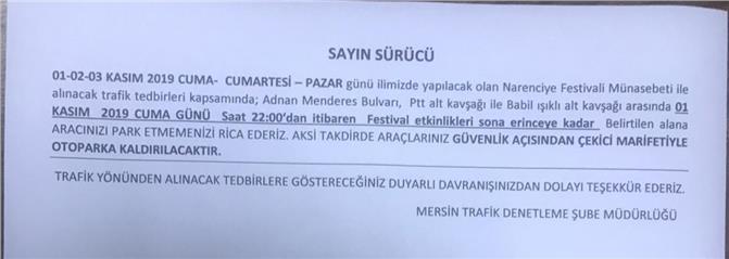 Yapılan açıklama şu şekilde, "Cuma cumartesi pazar günü ilimizde yapılacak olan narenciye Festivali münasebeti ile alınacak trafik tedbirleri kapsamında; Adnan Menderes Bulvarı PTT alt Kavşağı ile Babil Işıklı Hal Kavşağı arasında 1 Kasım 2019 Cuma günü saat 22: 00'dan itibaren Festival etkinlikleri sona erinceye kadar belirtilen alana aracınızı park etmemenizi rica ederiz. Aksi takdirde araçlarınız güvenlik açısından çekici marifetiyle otoparka kaldırılacaktır" şeklinde duyuru yapıldı.