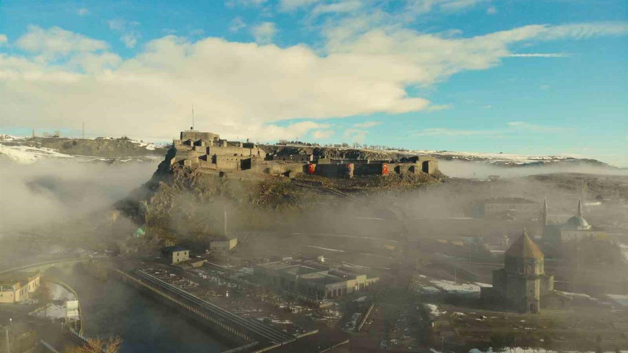 Kars Kalesi, şehir merkezine hakim bir konumda bulunmakta ve sabah saatlerinde etkisini gösteren yoğun sis nedeniyle zaman zaman tamamen kayboldu. Sis, tarihi yapının etrafında bir örtü gibi yayılırken, aynı karede yer alan tarihi kilise ve Evliya Camisi de sisin arasından siluet şeklinde belirdi. Bu eşsiz görüntüler, Kars'ın tarihi dokusunu farklı bir atmosferle buluşturdu.