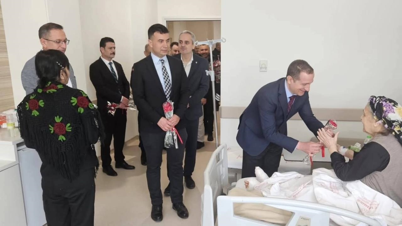 Ziyarette hastane personeli ile hasta ve hastalarla sohbet eden Kaymakam Akyüz, ziyaret hasta ve hasta yakınlarına birer çiçek de takdim etti.
