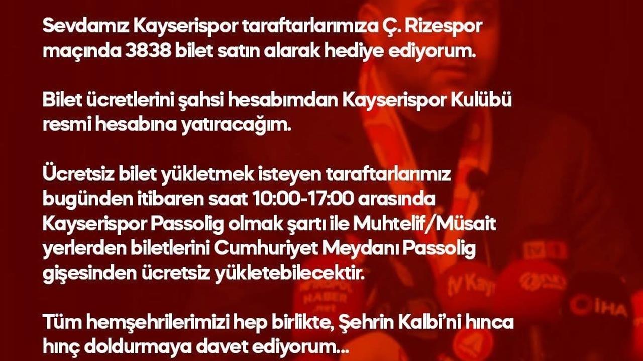MHP Kayseri Milletvekili Baki Ersoy, Kayserispor ile Çaykur Rizespor arasında oynanacak maça taraftarlar için 3838 bilet dağıtacağını açıkladı.