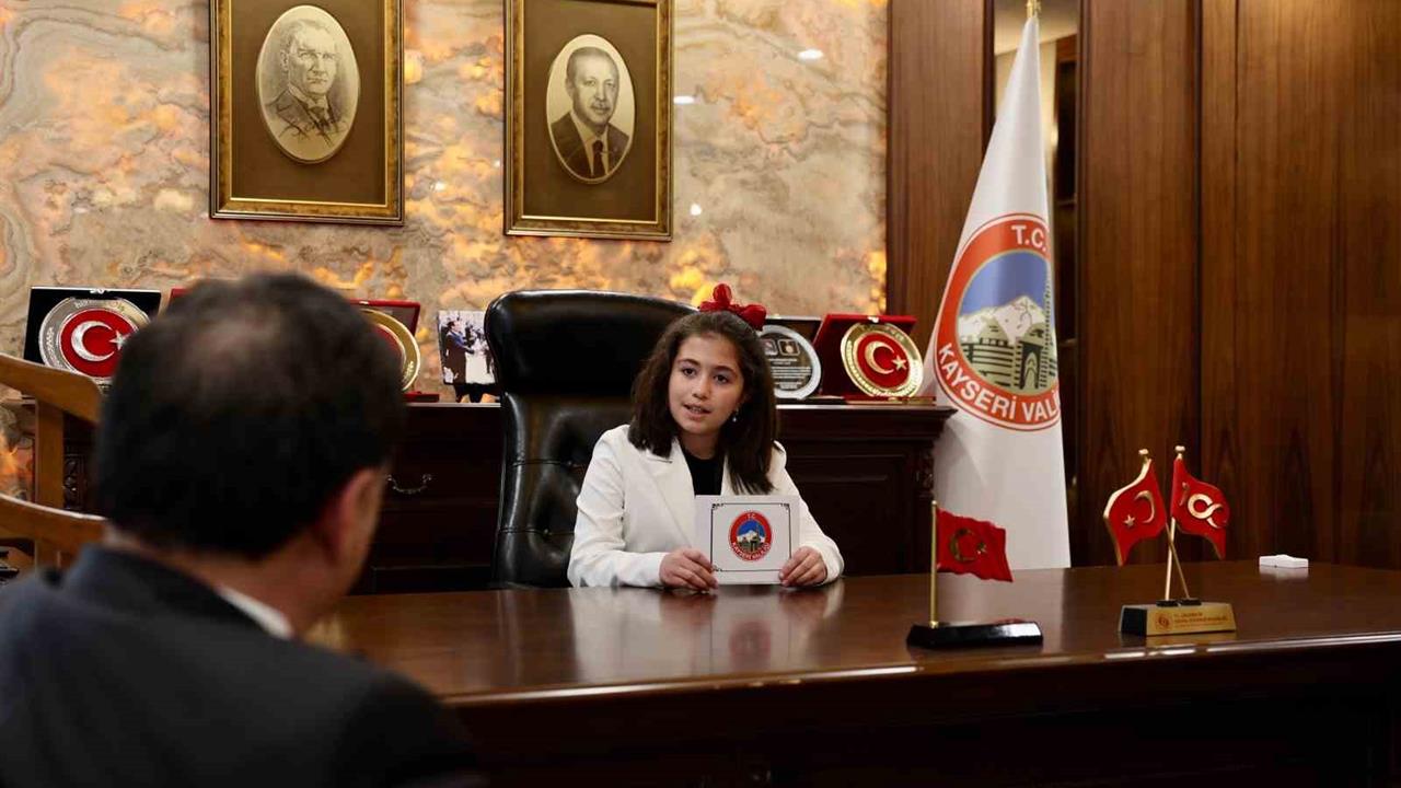 Kayseri'de 23 Nisan Ulusal Egemenlik ve Çocuk Bayramı için özel bir program düzenlendi. Vali Gökmen Çiçek, Talas ilçesi TOKİ Şehit Levent Çetinkaya İlkokulu'ndan 4. sınıf öğrencisi Zeynep Gedikbaş’ı makamında kabul etti. Öğrencilerin bayram coşkusunu paylaşmak amacıyla gerçekleştirilen etkinlikte, Zeynep Gedikbaş, Vali Çiçek’in koltuğuna oturarak, çocukların duygu ve düşüncelerini dile getirdi.