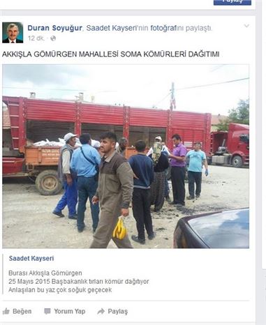 Kayseri'de, Saadet Partisi (SP) milletvekili adayı Duran Soyuğur, yaz mevsimine girilmesiyle birlikte Başbakanlık TIR'larının kömür dağıtımında bulunduğunu duyurdu. Soyuğur, bu durumu sosyal medya hesabından paylaştığı fotoğraflarla destekleyerek, "Bu yaz çok soğuk geçecek" şeklinde espri yaptı. 7 Haziran seçimleri öncesinde adaylar, köylerde ve ilçelerdeki etkinliklerini sosyal medya üzerinden aktarmaktadır. Duran Soyuğur, Akkışla ilçesine bağlı Gömürgen'de gerçekleştiren kömür dağıtımını belgeleyerek, "Akkışla Gömürgen'de Soma kömürleri dağıtılıyor. 25 Mayıs 2015'te Başbakanlık TIR'ları kömür dağıtıyor" ifadelerini kullandı.