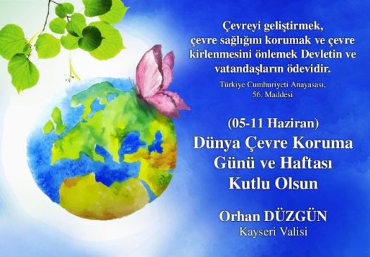 Kayseri Valisi Orhan Düzgün, 5 Haziran Dünya Çevre Günü dolayısıyla yayımladığı mesajda, "Özellikle geride bıraktığımız yüzyıldaki hızlı sanayileşme, kentleşme ve dengesiz nüfus artışı ile meydana gelen çevre sorunu, insanlığın geleceğini de yakından ilgilendirmekte ve her geçen gün büyük tehlikeleri de beraberinde getirmektedir" ifadelerine yer verdi.