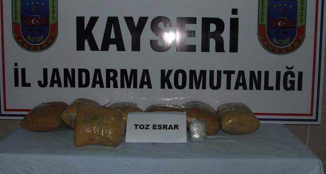 Kayseri İl Jandarma Komutanlığı'na bağlı Kaçakçılık ve Organize Suçlarla Mücadele Şube Müdürlüğü ekiplerinin gerçekleştirdiği operasyonda, Pınarbaşı ilçesinin Kızıldere mevkiinde yapılan aramalarda 10 kilo toz esrar ele geçirildi. Elde edilen uyuşturucu madde, dedektör köpekler yardımıyla tespit edildi.