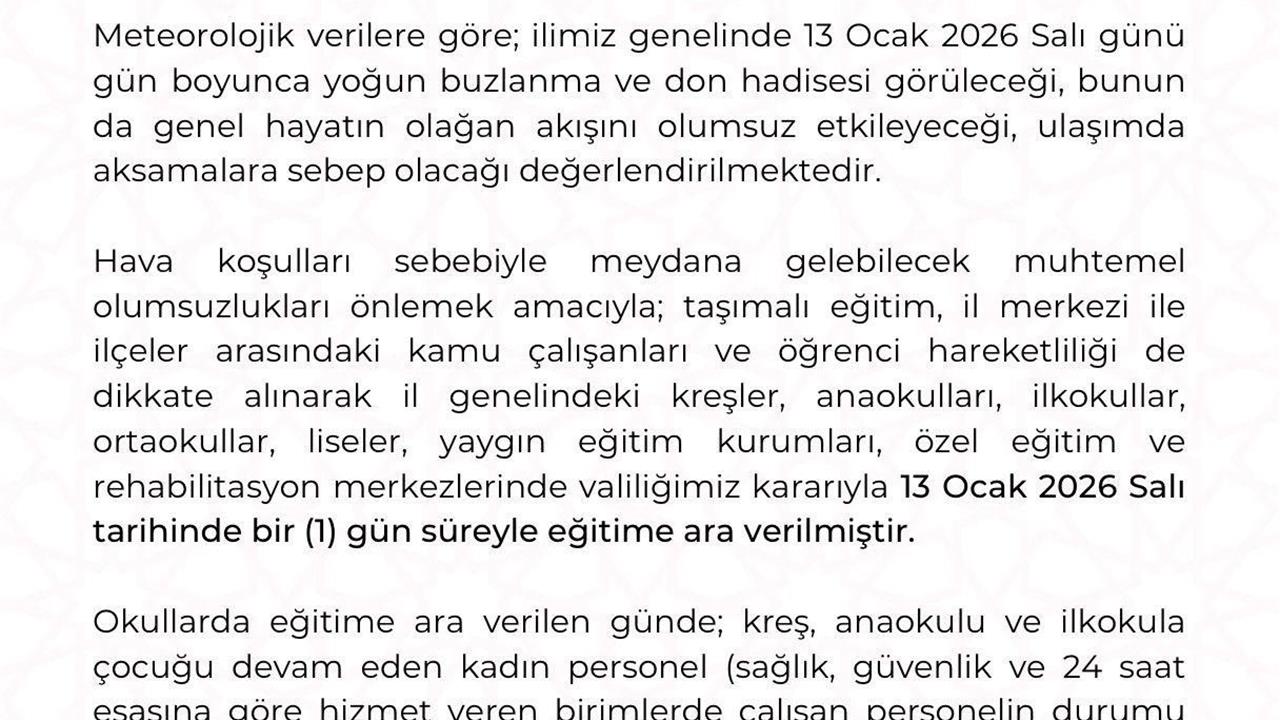 Alınan bu karar, il genelindeki tüm eğitim kurumlarını kapsıyor. Kreşlerden özel eğitim merkezlerine kadar birçok kurum, bu tarihte faaliyet göstermeyecek. Hava koşullarının düzelmesi durumunda eğitim öğretime kaldığı yerden devam edileceği ifade edildi. Kayseri'de yaşayan vatandaşların, bu süreçte dikkatli olmaları ve zorunlu olmadıkça dışarı çıkmamaları önerildi. Ayrıca, hava durumu takip edilerek, gereken önlemlerin alınması gerektiği vurgulandı.