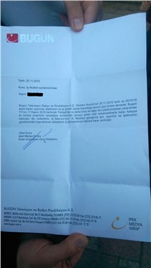 İşten çıkartılan gazetecilere yapılan yazılı tebligatta, “Bugün Televizyon Radyo ve Prodüksiyon AŞ. Yönetim Kurulu'nun 20.11.2015 tarih ve 2015/15 sayılı kararı uyarınca işletmenin ve işyerinin içinde bulunduğu durum göz önüne alınarak; Bugün TV'nin 17.11.2015 tarihinde Türksat'tan ve daha önce de diğer tüm platformlardan çıkarılması ile birlikte erişiminin neredeyse sonlanması sonucu şirket mali imkansızlıklarla karşı karşıya kalmıştır. Bu nedenlerle İş Kanunu'nun 18. maddesi gereğince işin, işyerinin ve işletmelerin gereklerinden kaynaklanan sebeplerle sözleşmenizin feshine karar verilmiştir.” ifadeleri yer aldı.