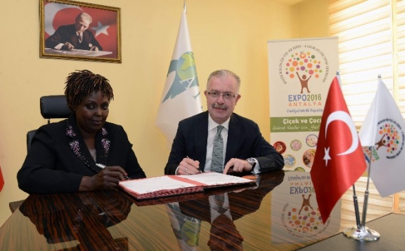 Kenya'nın EXPO 2016 Antalya'ya katılımı, ülke komiseri Stella Nkırote Kırera'nın anlaşmaya imza atmasıyla gerçekleşti. Kırera, Kenya Tarım Hayvancılık ve Balıkçılık Bakanlığı tarafından atanmış olup, EXPO 2016'nın yapılacağı alanı ziyaret etti. Ziyareti sırasında, alandaki yönetim binasında Antalya EXPO Ajansı Genel Sekreter Vekili Faik Akturan ve Genel Sekreter Yardımcısı Levent Murat Danışman ile bir araya geldi. Kenya bahçesinin yeri, inşaat çalışmaları ve ticari faaliyetler konularında bilgi aldı. Yapılan brifingin ardından katılım anlaşması imzalandı. Genel Sekreter Vekili Akturan, “Kenya’yı expoda görmekten mutluyuz. Antalya, yıllık 15 milyona yakın turist çeken bir turizm kentidir. Bu kenti ikinci vatanınız gibi görün” ifadelerini kullandı. Kırera da EXPO 2016'da yer almaktan memnuniyetini dile getirdi. Anlaşmaya göre Kenya, 1.200 metrekarelik bir bahçe kuracak. Genel Sekreter Vekili Akturan, Kırera'ya EXPO 2016'nın simgesi olan Şakayık ile birlikte Antalya kitapçığı ve çeşitli hediyeler sundu.