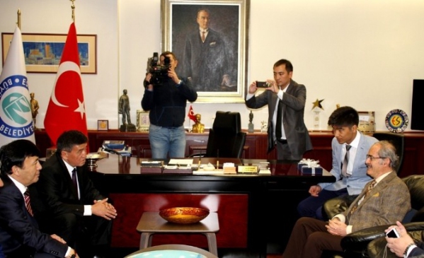 Kırgızistan’ın Osh Valisi Sooronbai Jenbekov, Eskişehir Büyükşehir Belediye Başkanı Yılmaz Büyükerşen’i ziyaret etti. Ziyaret sırasında, Vali Jenbekov, Kırgızistan Devlet Başkanı Almazbek Atambayev’in Başkan Büyükerşen’e özel selamlarını iletti. Eskişehir’in kültürel değerlerine hayran kaldığını belirten Jenbekov, "Özellikle Balmumu Müzesi'nden çıkmak istemedim. Başkan Büyükerşen’in balmumu heykeliyle selamlaştım. Balmumu Müzesindeki eserleri, Osh'da sergilemek isteriz. Devlet Başkanımız Atambayev sizi çok seviyor ve çalışmalarınızı takdir ediyor. Selamlarını ve iyi dileklerini gönderdi. Sizi Kırgızistan’da görmek istiyoruz" dedi. Başkan Büyükerşen ise, Kırgızistan hakkında bilgi alarak, "Sayın Kırgızistan Devlet Başkanı Atambayev’e sevgilerimi ve selamlarımı iletin. Kardeş ülkeler aralarında ekonomik ve siyasi bir güç oluşturmalı. Böylece birlikte daha hızlı gelişim sağlayabiliriz. Ülkelerimiz arasındaki ticaretin ve kültürel alışverişin geliştirilmesi en büyük dileğim. Eskişehir Büyükşehir Belediyesi olarak, bu konularda yardıma ve işbirliğine hazırız" ifadelerini kullandı. Ziyaretin sonunda, Vali Jenbekov, Eskişehir’e ait Kırgızistan’ın dünyaca tanınan Manas Destanı’nı anlatan bir tablo hediye etti.