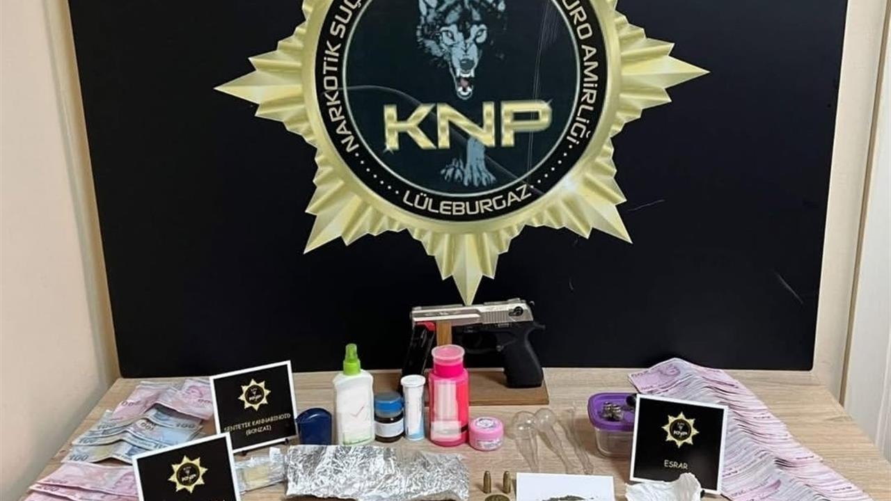 Kırklareli'nin Lüleburgaz ilçesinde, uyuşturucu madde imal ve ticareti yapan şahıslara yönelik olarak İl Emniyet Müdürlüğü Narkotik Suçlarla Mücadele Şube Müdürlüğü tarafından eş zamanlı bir operasyon gerçekleştirildi. Yapılan operasyonda toplamda 12,61 gram metamfetamin, 130,98 gram sıvı sentetik kannabinoid, 15,83 gram sentetik kannabinoid, 0,93 gram skunk ve 0,11 gram esrar ele geçirildi. Ayrıca, operasyon sırasında 3 adet hassas terazi, 1 adet grinder, suçtan elde edildiği değerlendirilen 42 bin 675 TL ile 5 euro, 1 adet tabanca, 2 adet tabanca fişeği ve 4 adet payp da ele alındı.