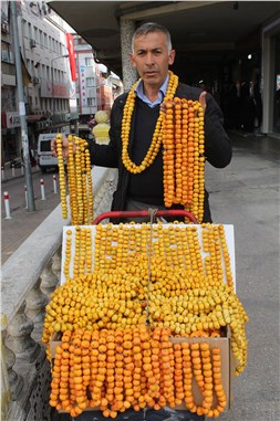 Yüksek kesimlerde yetişen, sarı ve turuncu renkli meyvesiyle bilinen alıç meyvesini 25 yıldır sattığını belirten Necmi Yüceyurt, Soğuk Çermik ve Meraküm mevkileri ile çevre ilçelerden toplanan alıcın güzel görünümlü olması ve kolayca yenilmesi için iplere dizildiğini belirterek, bağını 3 liradan sattıklarını ifade etti.