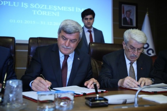 Konuşmaların ardından, Başkan Karaosmanoğlu, Genel Başkan Öztürk ve diğer yetkililer toplu iş sözleşmesine imza attı. Sözleşme, 1 Ocak 2015’ten 31 Aralık 2016’ya kadar geçerli olacak. İmza töreninin ardından personel, Başkan Karaosmanoğlu ve Genel Başkan Öztürk’e çiçek takdim etti. Tören, hatıra fotoğrafı çekimiyle sona erdi.