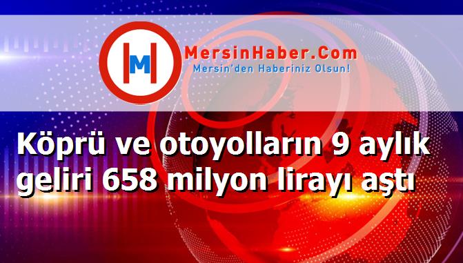 9 aylık dönemde otoyol ve köprüleri kullanan 309 milyon 804 bin 62 araçtan toplam 658 milyon 161 bin 259 lira gelir sağlandı. Köprü ve otoyollarda bu yılın 9 ayında en yüksek gelir ağustos ayında elde edildi. Söz konusu ayda köprü ve otoyolu kullanan 39 milyon 145 bin 66 araçtan, 86 milyon 515 lira para tahsilatı yapıldı. Ocak-Eylül döneminde köprü ve otoyollarda en düşük gelir şubat ayında gerçekleşti.