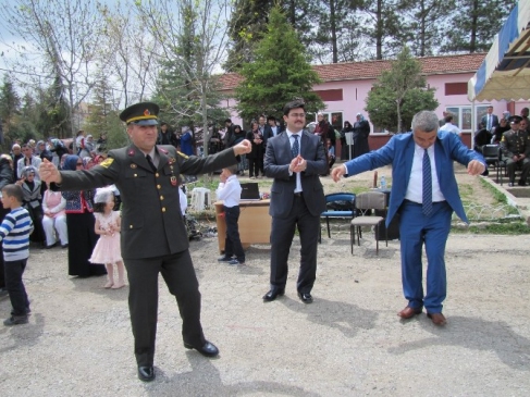 Kütahya'nın Hisarcık ilçesinde, 23 Nisan Ulusal Egemenlik ve Çocuk Bayramı törenleri, hava muhalefeti nedeniyle ertelenmişti. Törenin yapıldığı Atatürk İlkokulu bahçesinde, etkinlik sonunda sunucu Öğretmen Erhan Önal, ilçe protokolünü sahneye davet etti. Kaymakam Fethi Savran, Garnizon Komutanı Oğuz Uçak ve Belediye Başkanı Fatih Çalışkan, öğretmenlerle birlikte Ankara havası eşliğinde oyun oynadılar. Protokol üyelerinin bu eğlenceli anları, izleyiciler tarafından büyük bir coşkuyla alkışlandı. (MA-EFE)
