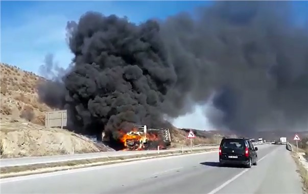 ÇORUM - Çorum'da lastik yüklü bir TIR, seyir halindeyken yanmaya başladı. Kısa sürede büyüyen yangın, cep telefonu ile saniye saniye kaydedildi.