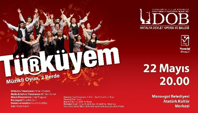 Antalya Devlet Opera ve Balesi, "Türküyem" isimli iki perdelik müzikli oyunu Manavgat'ın Atatürk Kültür Merkezi'nde izleyicilerle buluşturacak. Orkestra Yönetmenliği Ömer Yöndem tarafından gerçekleştirilen oyunun sahne yönetimi ve metin yazarlığı Fatih Şanal’a ait. Müzik ve düzenlemesi Erdal Tuğcular tarafından yapılan eserde, sopranolar Arzu Aydoğdumu, Sinem Baddal ve Semiha Boran ile birlikte tenörler Fatih Şanal, Basta Tükel Acar ve Emre Akyurt sahne alacak. Ayrıca Sevgim Aksoy, Burak Burçak, Sinem Ertan, Kürşat Kılıç, Seda Manaz, Burak Özbek, Mert Söylemez, Devrim Saraçoğlu ve Buket Tüzün de performans sergileyecek. Eser, dinleyicileri türkülere eşlik eden metinlerle günümüz coğrafyasının kültürel değerleri üzerine düşünmeye teşvik ediyor. Manavgat Belediye Başkanı Şükrü Sözen, tüm vatandaşları bu özel performansı izlemeye davet etti.