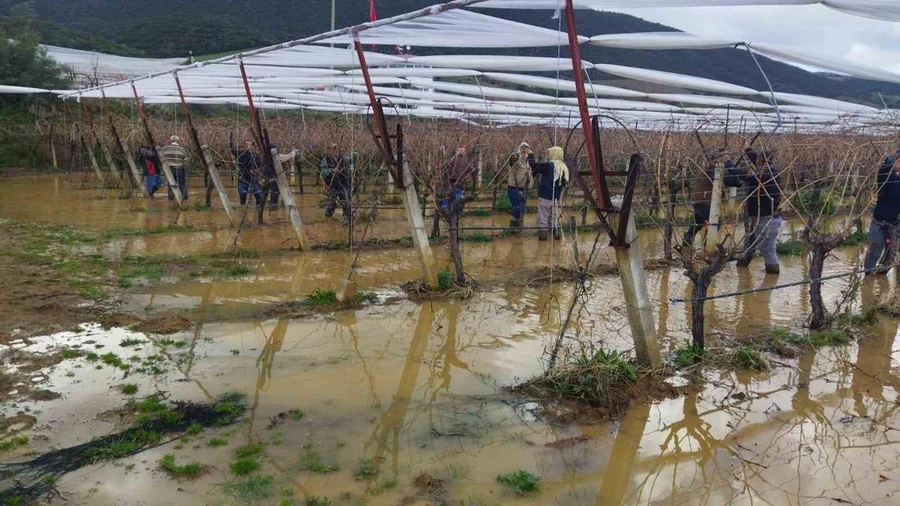 Manisa'nın Sarıgöl ilçesine bağlı Emcelli Mahallesi Sütmezli mevkisinde meydana gelen yağışlar, üzüm bağlarının göle dönüşmesine sebep oldu. Su altında kalan bağlarda budama yapan işçiler, zorlu koşullara rağmen ekmek parası kazanmak için çalışıyorlar. Bağlarda biriken su, işlerin ilerlemesini güçleştirirken, işçiler işlerini aksatmadan sürdürme çabası içindeler.