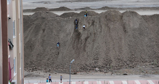 Manisa'da bir inşaatın zemin düzleme çalışmaları sırasında çıkartılan topraklar, yaklaşık 15 metrelik büyük bir tepe haline geldi. Bu toprak yığını, çevresinde güvenlik önlemleri alınmadığı için çocukların oyun alanı haline geldi. Gevşek zemin üzerinde tırmanan çocuklar, toprak yığınını kaydırak gibi kullanarak tehlikeye davetiye çıkarıyorlar.