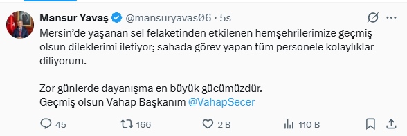 Resmi sosyal medya hesapları üzerinden Mersin halkına ve Mersin Büyükşehir Belediye Başkanı Vahap Seçer’e geçmiş olsun dileklerini ileten Yavaş, birlik ve beraberlik vurgusu yaptı.