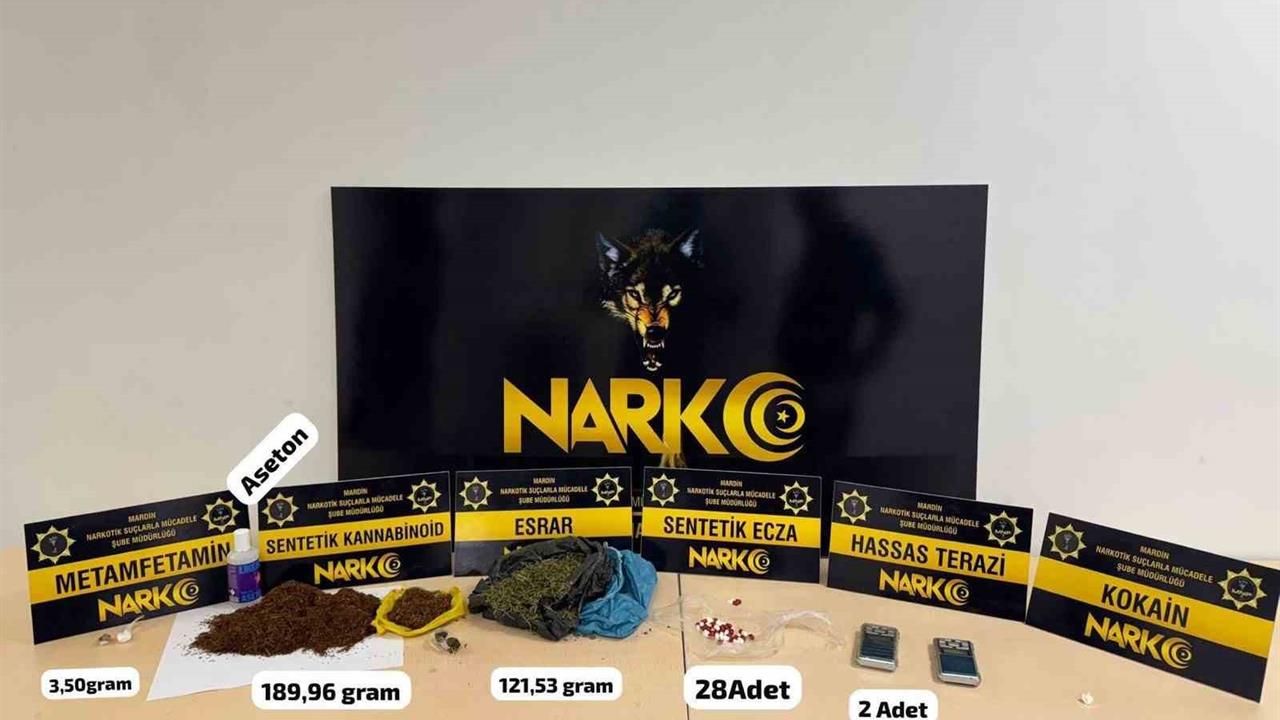 Mardin’in Kızıltepe ilçesinde, İl Emniyet Müdürlüğü Narkotik Suçlarla Mücadele Şube Müdürlüğü tarafından düzenlenen uyuşturucu operasyonunda 2 şüpheli yakalandı. Yapılan açıklamada, uyuşturucu madde ticareti ve kullanımının önlenmesine yönelik çalışmaların devam ettiği belirtildi. Bu bağlamda, Kızıltepe'de tespit edilen bir adreste gerçekleştirilen aramalarda, 189,96 gram bonzai, 121,53 gram esrar, 3,50 gram metamfetamin, 0,71 gram kokain, 28 adet sentetik ecza hapı, 2 şişe aseton ve 2 adet hassas terazi ele geçirildi.