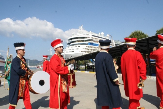 Marmaris'te ilk kez gelen Aida Stella yolcu gemisi mehteran eşliğinde karşılandı. 2 bin 300 yolcu, kentin tarihi yerlerini gezmek için otobüslerle ayrıldı.