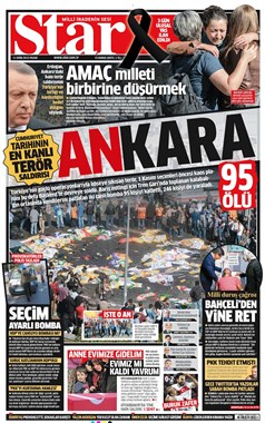 Star: Ankara. Cumhuriyet tarihinin en kanlı terör saldırısı. 95 ölü. Amaç milleti birbirine düşürmek.