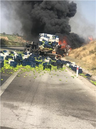 Mersin - Adana arası otobanda tanker ile limon yüklü kamyon çarpıştı.